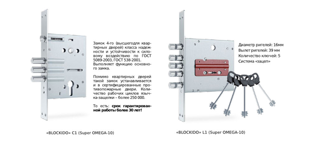 Замки сувальдного типа Blockido – 4-го класса по ГОСТ 5089-2003, ГОСТ 538-2001, разработанный на основе лучшего полицейского замка Европы*. В России производится с конца 90-х годов. Используется в качестве замка в дверях, сейфах и металлических шкафах.