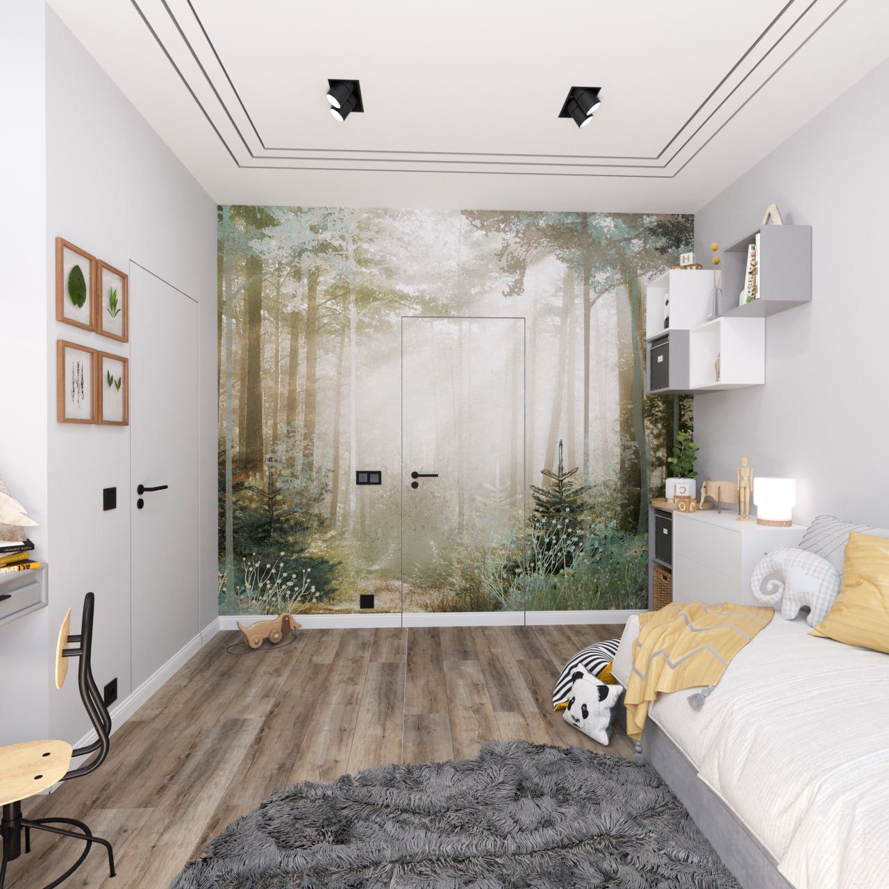 - Дверь во всю высоту стены. Полотно, занимающее всю высоту помещения от пола до потолка, будет визуально напоминать декоративную стеновую панель, особенно при использовании нестандартных рисунков обоев на фоне однотонной стены.