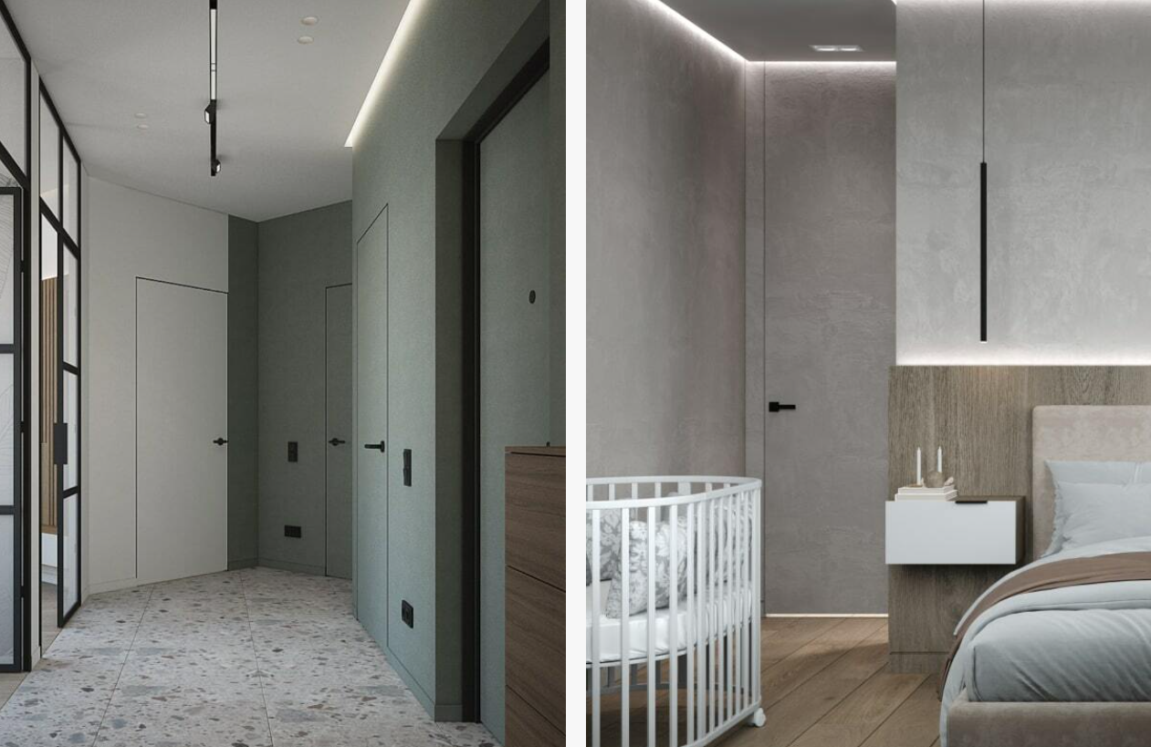 Скрытые двери практически сливаются со стеной, и обнаружить их можно только по едва заметным контурам и ручке. Именно в этом и заключается их главная особенность и изюминка.