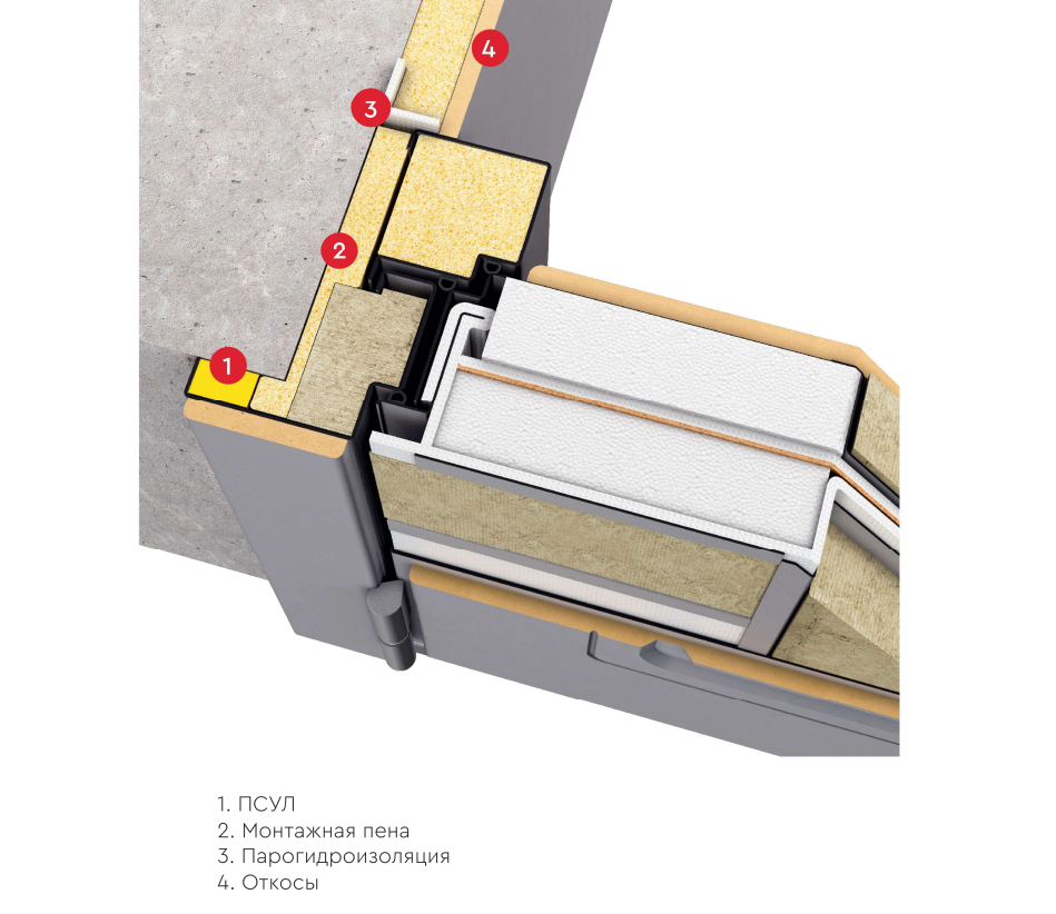 При монтаже все полости между коробом и стеной должны быть тщательно заполнены полиуретановой монтажной пеной. Рекомендуется использовать ПСУЛ (предварительно сжатая саморасширяющаяся уплотнительная лента) на стыке наличника со стеной с внешней стороны двери. Это позволит минимизировать попадание в помещение влаги и воздуха с улицы и, как результат, снизит вероятность выпадения конденсата на коробе с образованием наледи в холодное время года.